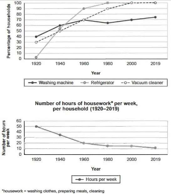 The charts below show the changes in ownership of electrical appliances and amount of time spent doing housework in households in one country between 1920 and 2019. Summarise the information by selecting and reporting the main features, and make comparisons where relevant. |