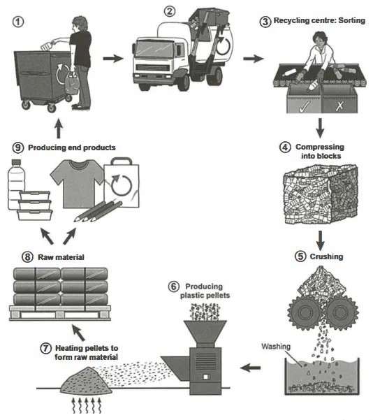 The diagram below shows the process for recycling plastic bottles. Summarise the information by selecting and reporting the main features, and make comparisons where relevant. |