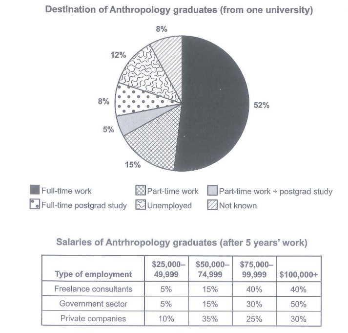 The chart below shows what Anthropology graduates from one university did after finishing their undergraduate degree course. The table shows the salaries of the anthropologists in work after five years. Summarize the information by selecting and reporting the main features, and make comparisons where relevant. |