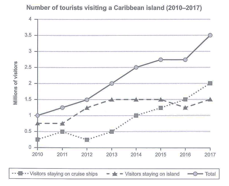 The graph below shows the number of tourists visiting a particular Caribbean island between 2010 and 2017. Summarise the information by selecting and reporting the main features, and make comparisons where relevant. |