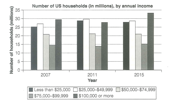 The chart below shows the number of households in the US by their annual income in 2007, 2011 and 2015. Summarise the information by selecting and reporting the main features, and make comparisons where relevant. |