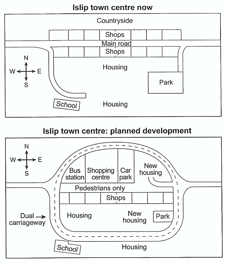 The maps below show the centre of a small town called Islip as it is now, and plans for its development. Summarise the information by selecting and reporting the main features, and make comparisons where relevant. |
