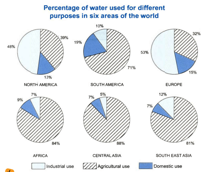 The charts below show the percentage of water used for different purposes in six areas of the world. Summarise the information by selecting and reporting the main features, and make comparisons where relevant. |